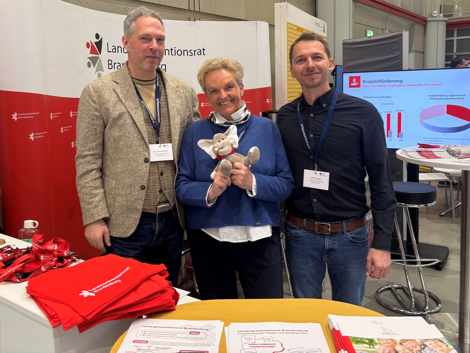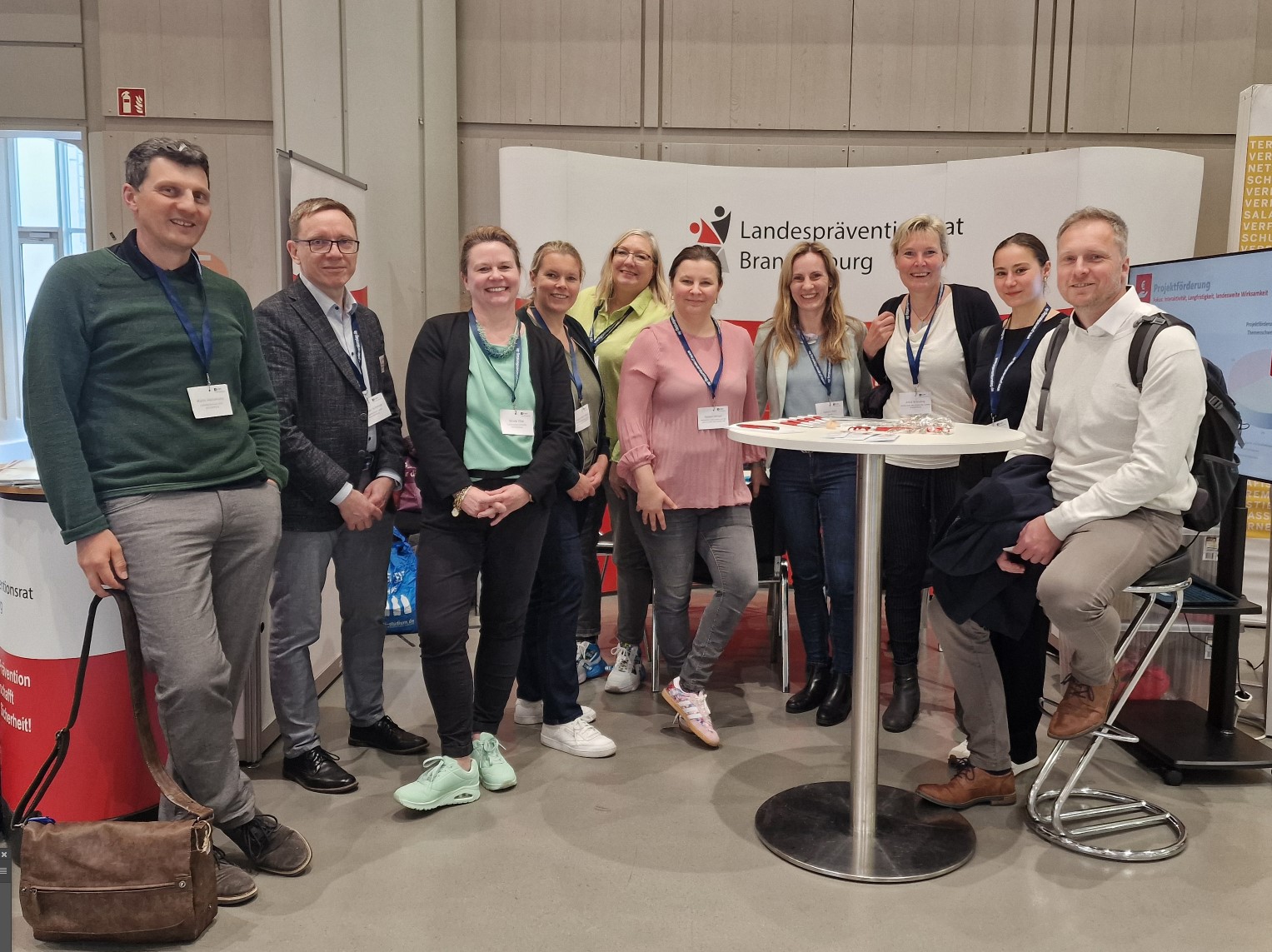 Das Team der Geschäftsstelle des Landespräventionsrates war mit einem eigenen Stand vertreten und nutzte diese Gelegenheit für fachliche Gespräche und Beratungen. Insbesondere auch zu Aspekten der Vertiefung der ohnehin bereits praktizierten länderübergreifenden Zusammenarbeit erfolgte ein intensiver Austausch mit den Teilnehmenden aus Berlin, Sachsen und Mecklenburg-Vorpommern.